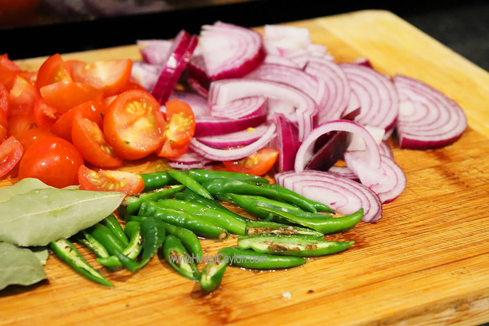 Slice the onions, slit the green chillies and dice the tomatoes.
