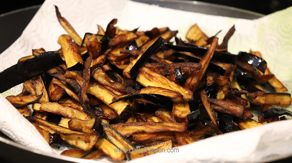 Cut the aubergine into sticks and deep fry.