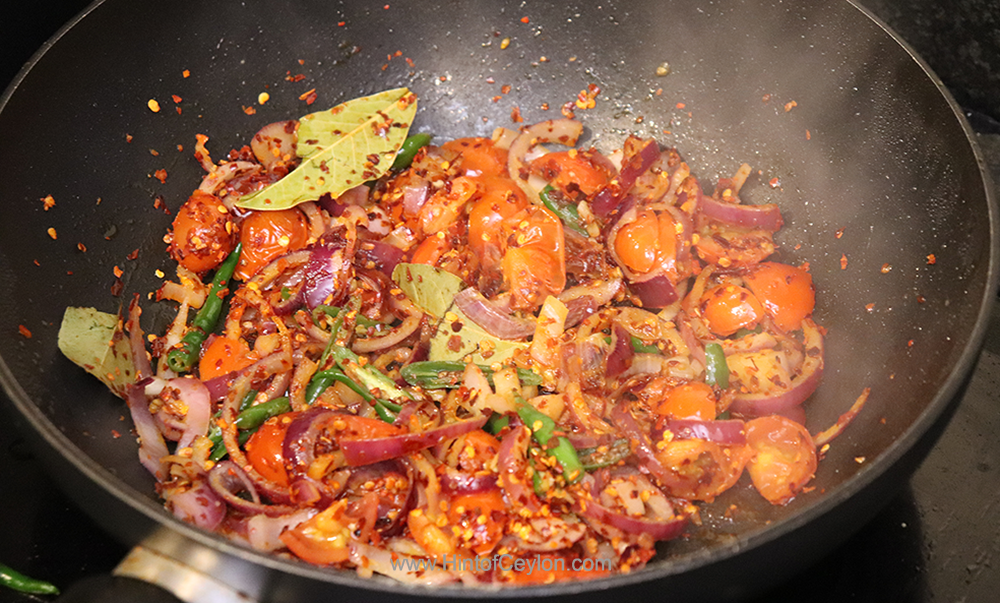 Heat oil in a pan. Add curry leaves, onions, tomatoes and green chillies. Fry until the onions are golden brown in colour. Add salt, sugar and chilli powder.