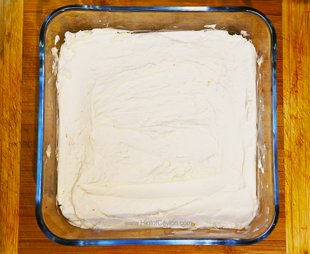 Spread a bit of the mixture on top of the layer. Then place another layer of sponge fingers and repeat the layers. The creamy mixture should be the top layer.
